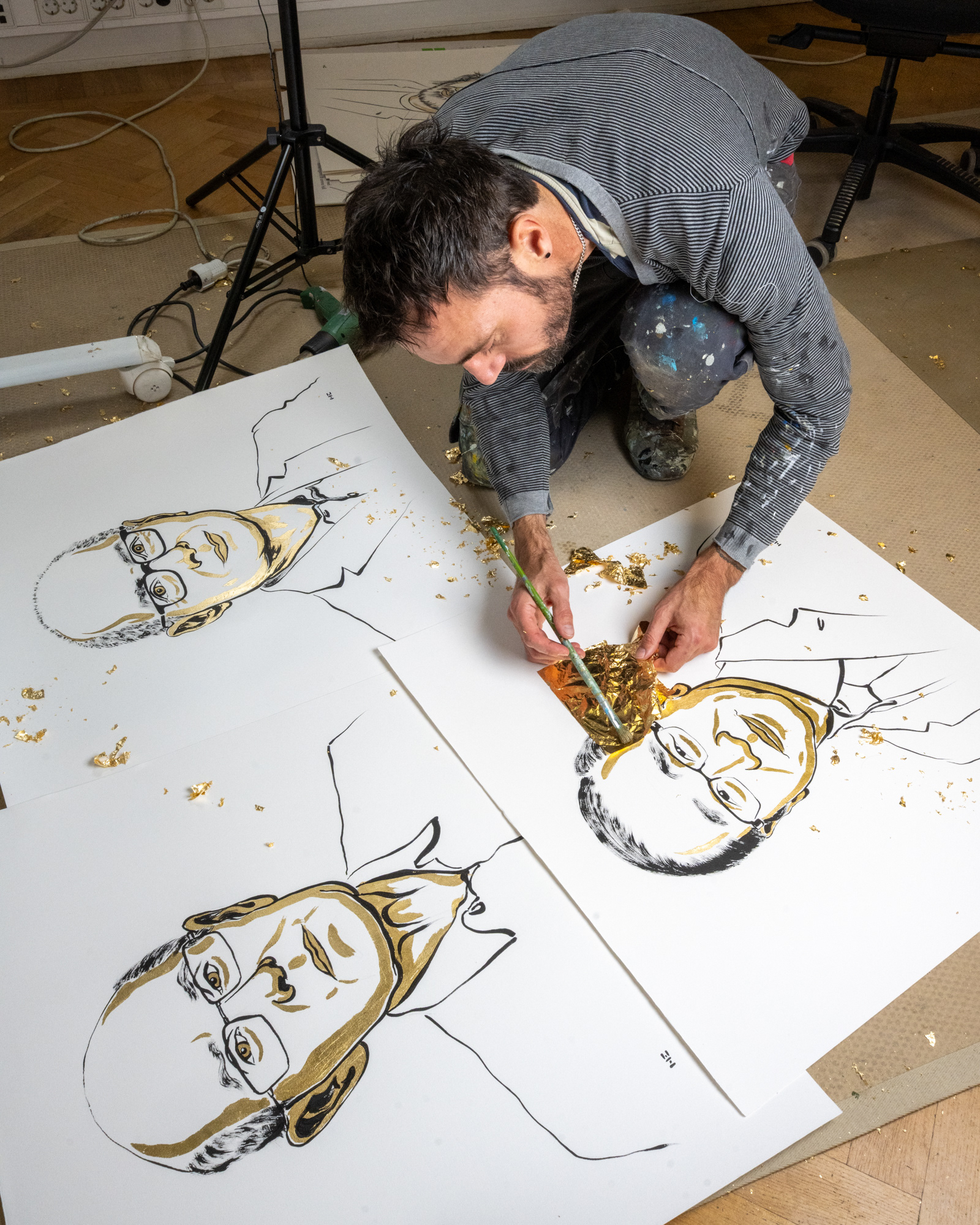 In 2017 it was decided that the main color for the announcements would be gold, preferably gold with texture not just a representational color. I adjusted my blue and yellow paintings, which was the look 2014-2017, to the new golden look. I experimented a lot with different gold paint and fell for the gold foil, a super thin metal foil that you can put on the painting with a special glue. Together with black outlines, painted on a white background I think the portraits has a very strong and exclusive impact.